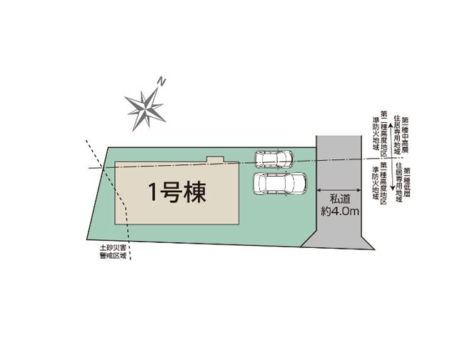 | 接道状況 | 接道: 北東 私道 道路幅: 4m | 用途地域 |