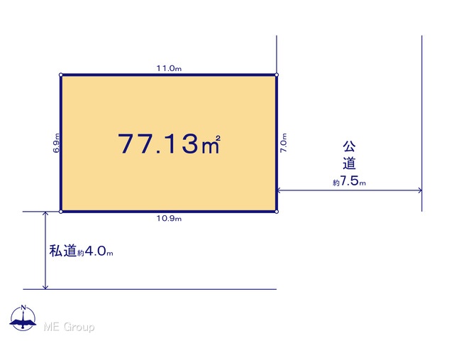 | 現況/引渡し | 更地/相談 | 接道状況 | 接道: 東 公道 道路幅: 7.5m 接道: 南 私道 道路幅: 4m |