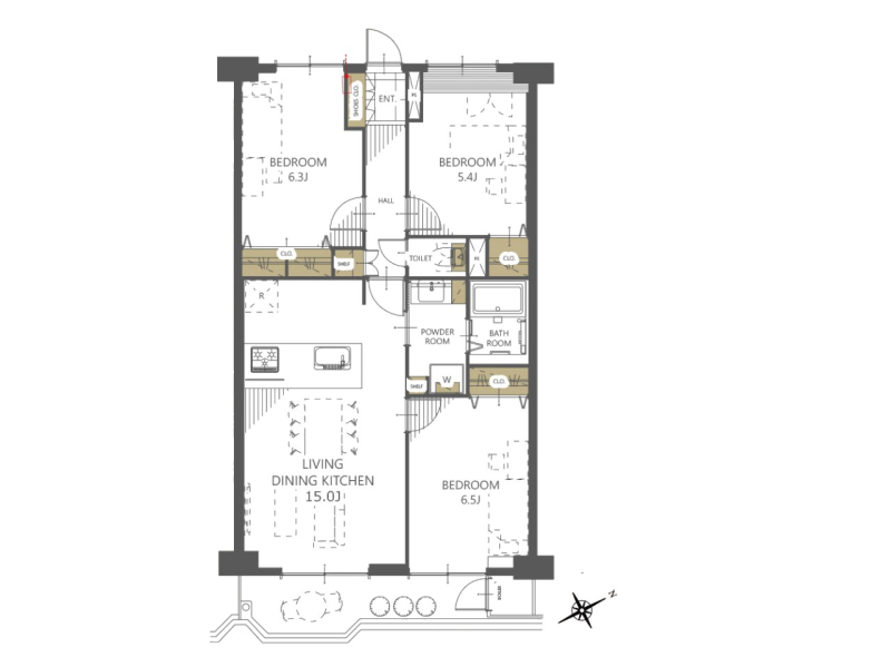 | 間取り | 3LDK (洋室6.5/洋室6.3/洋室5.4/LDK15) | ||||