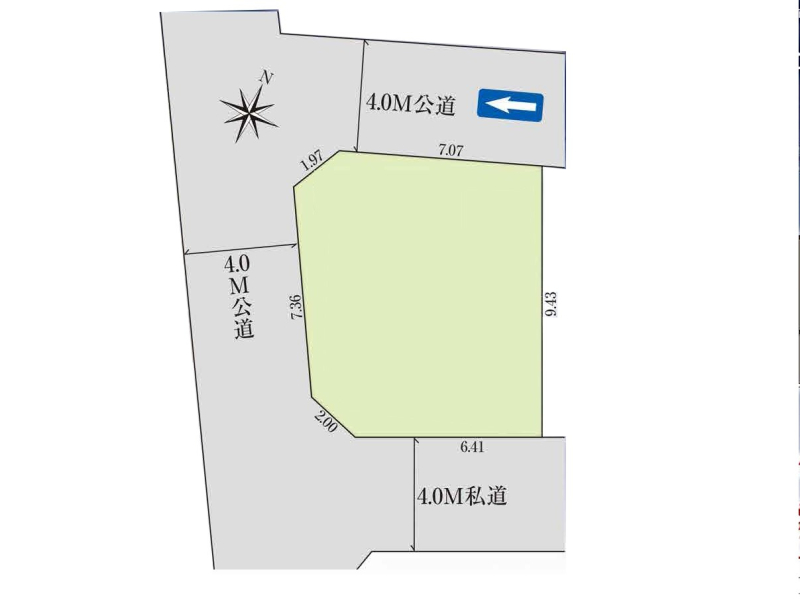 | 接道状況 | 接道: 北西 公道 道路幅: 4m 接道: 南西 公道 道路幅: 4m 接道: 東南 私道 道路幅: 4m |