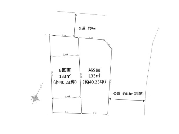 | 現況/引渡し | 更地/即時 | 接道状況 | 接道: 東 公道 道路幅: 8.3m 接道: 北 公道 道路幅: 6m |