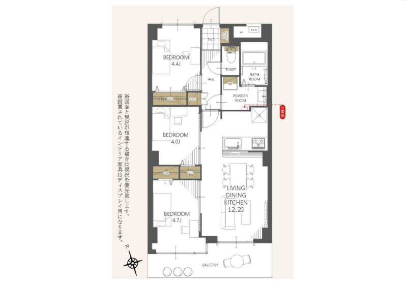 | 間取り | 3LDK (洋室4.7/洋室4.4/洋室4/LDK12.2) | ||||