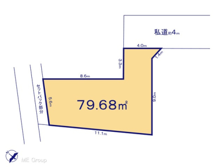 | 現況/引渡し | 更地/相談 | 接道状況 | 接道: 北東 公道 道路幅: 5.4m 接道: 東南 私道 道路幅: 4m |